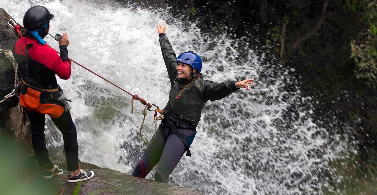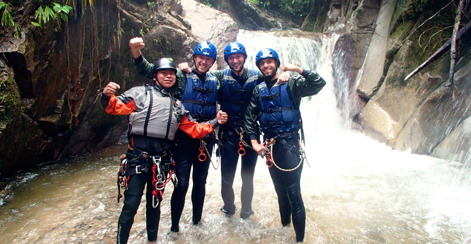 El tour empieza a las 9 am o 2pm desde la recepción del Hotel para luego dirigirnos a la oficina donde nos reuniremos con el Guía, luego desde la ciudad de Baños viajaremos por 20 minutos hasta el sector de Río Blanco, lugar donde se realiza la entrega del equipo personal completo, y la debidas instrucciones del guía e iniciar el descenso de las cinco cascadas con diferentes metros de altura que van desde los 10 hasta los 35 metros aproximadamente, utilizando técnicas de rapel y tobogán. Retorno Baños.